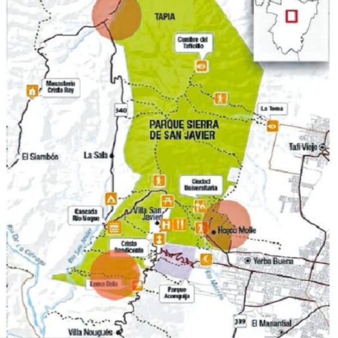 El parque Sierra de San Javier ocupa una amplia extensión del cerro tucumano, entre Villa Nougués (al sur) Horco Molle -Yerba Buena y Tafí Viejo (al este) La Sala (al oeste) y Raco y Tapia (al noroeste). Los terrenos fueron expropiados en 1947 a varias familias por la Nación para cedérselos a la Universidad para construir la Ciudad Universitaria, que años después quedó a medio hacer, aunque la UNT erigió varias instalaciones entre Horco Molle y la parte alta del cerro.